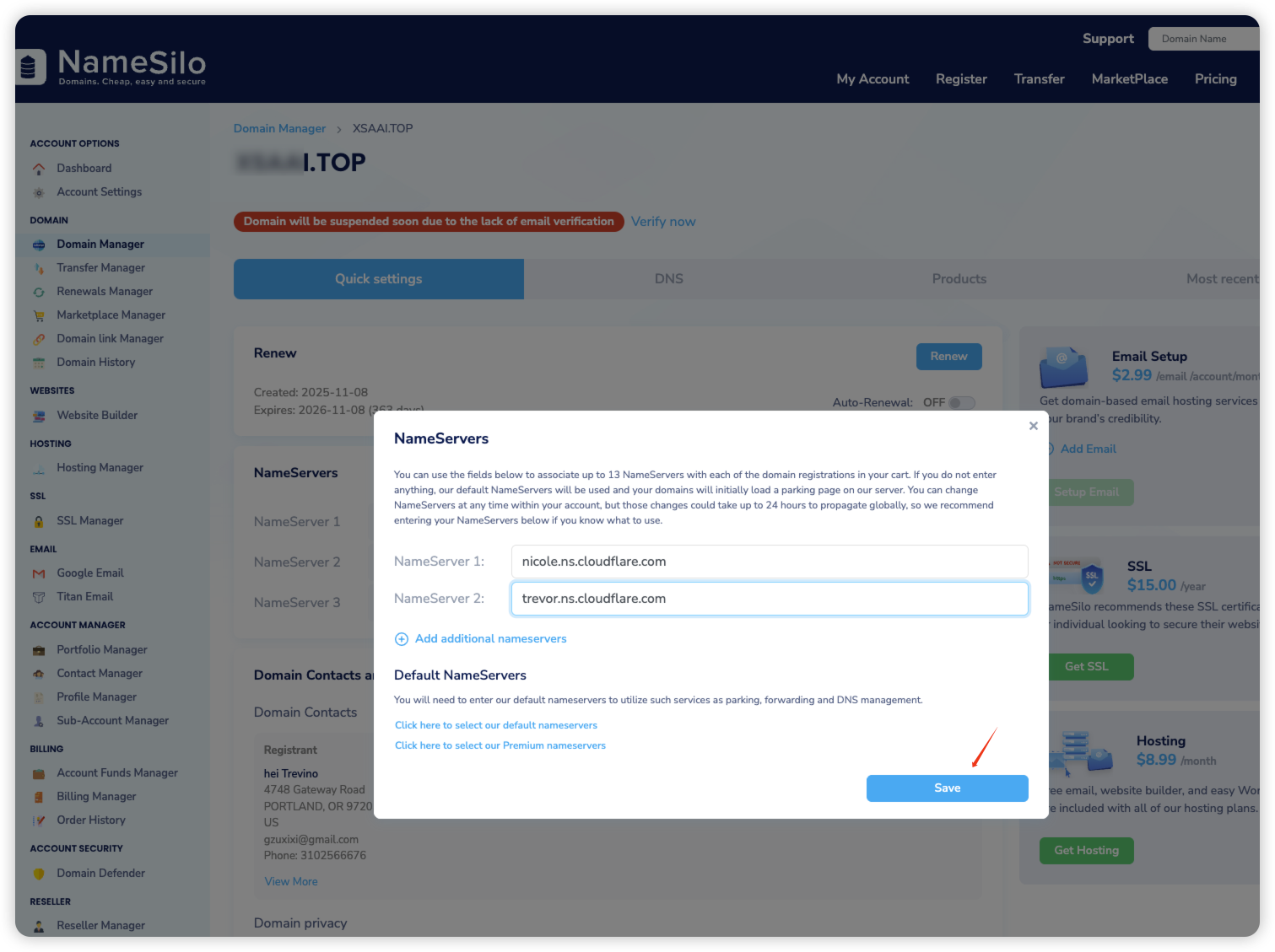 - 首先我们去更改Namesilo里购买域名的DNS,由cloudflare提供的DNS