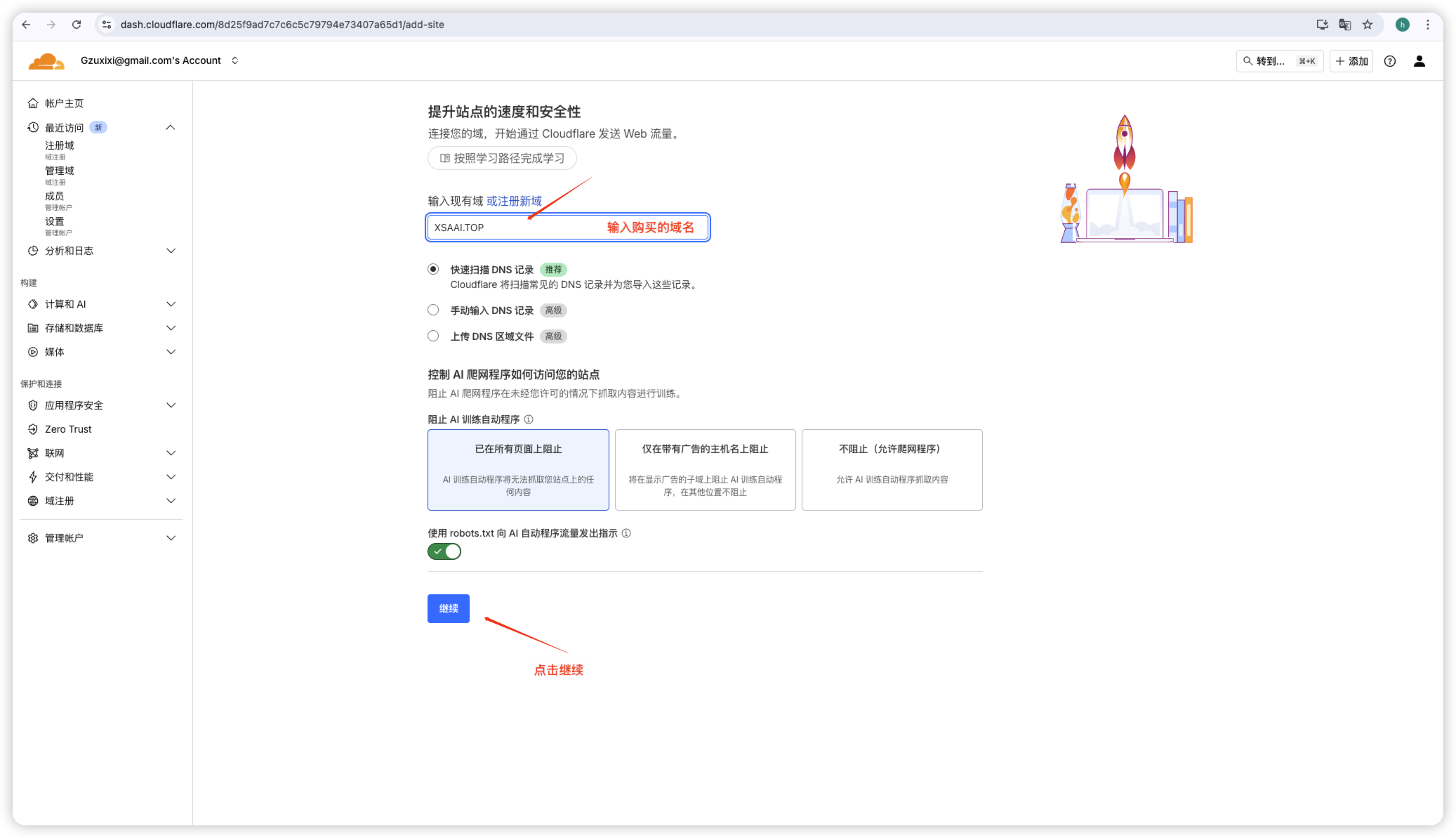 - 输入自己购买的域名,点击继续