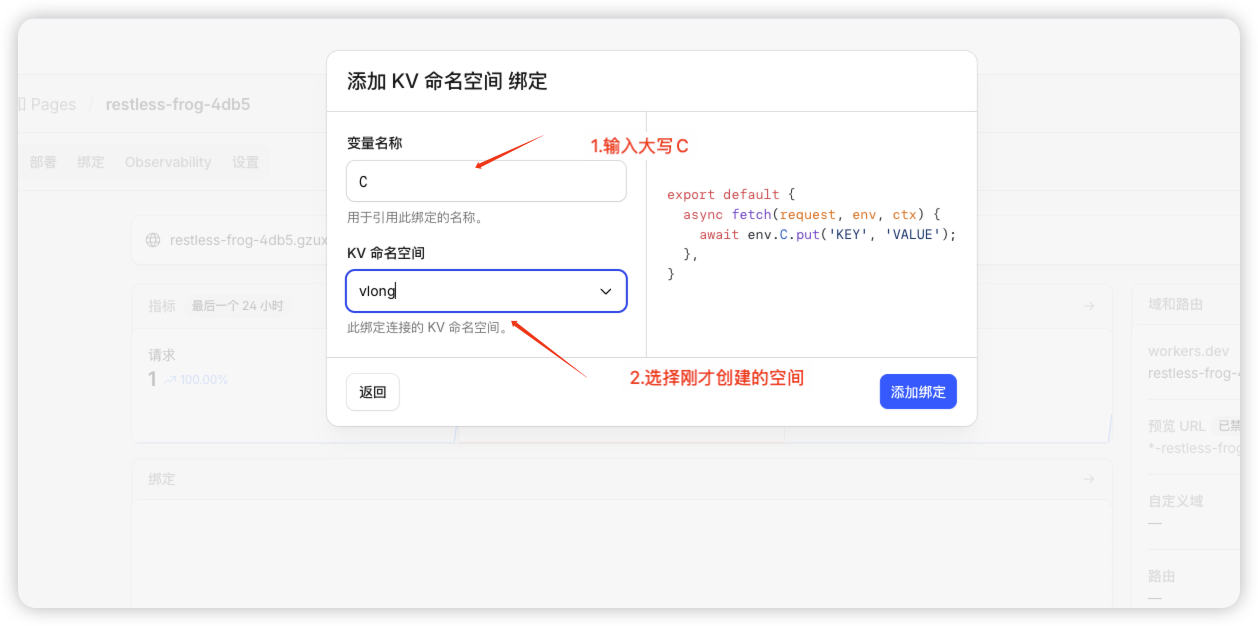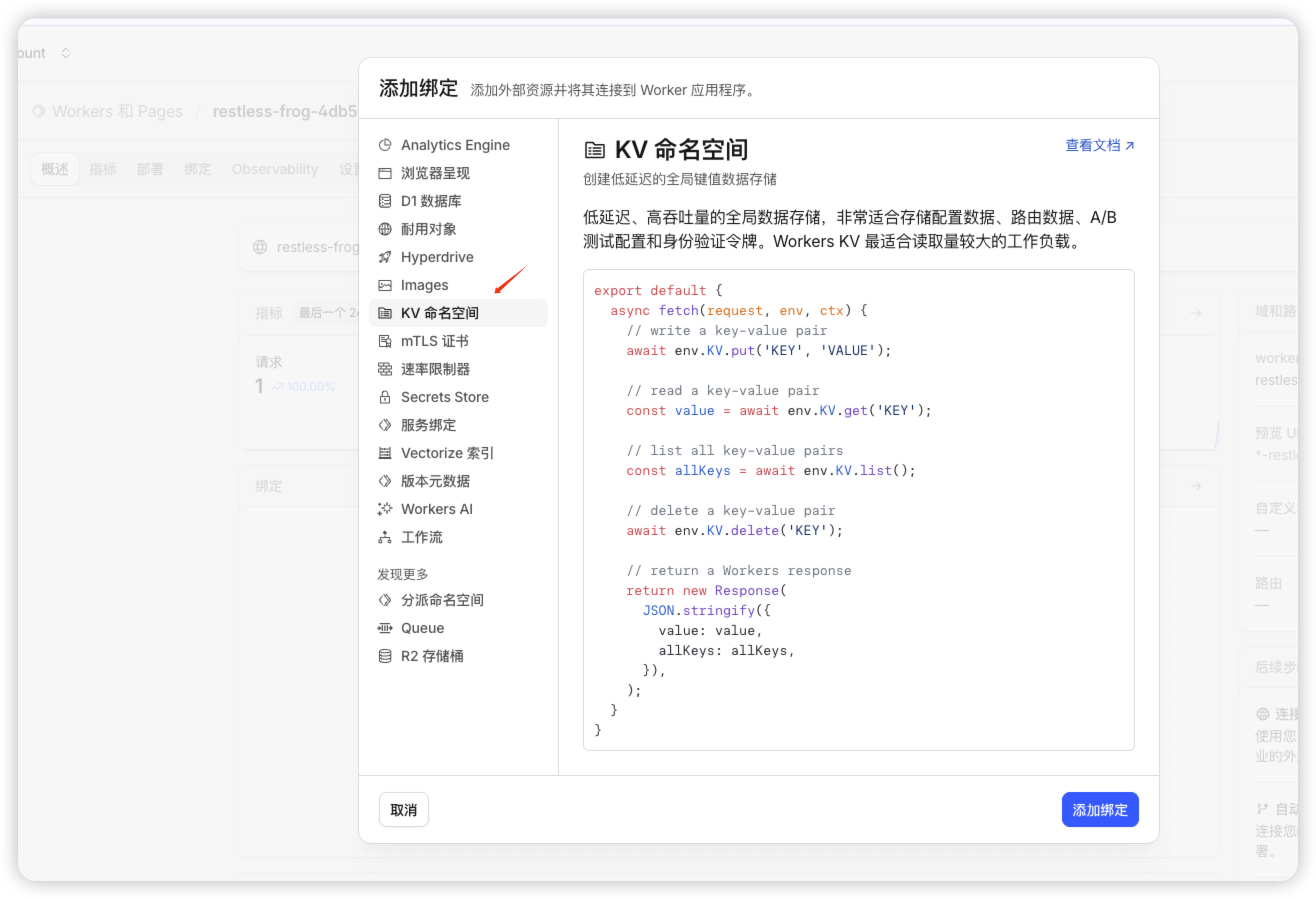 - 在里面创建 Workers 并 绑定 KV 空间