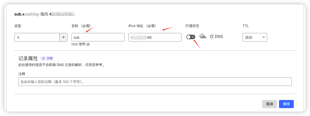- 解析域名,类型 A ,名称:随意 ,内容:VPS IP ,代理状态:关闭,TTL:自动