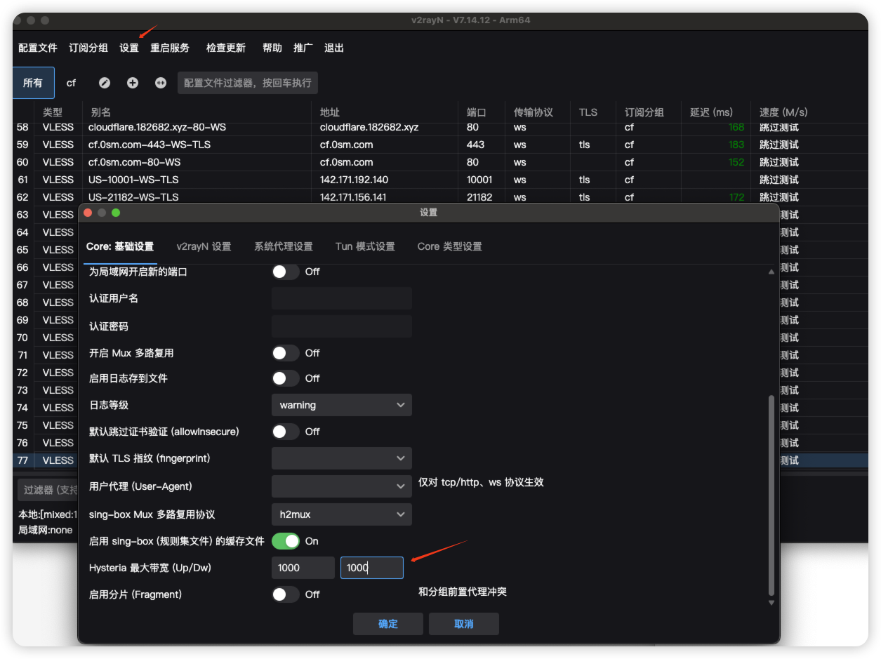- 重点!重点!重点!注意在电脑V2rayN软件中点击设置——参数设置——Hysteria最大带宽,原始设置100,请设置为1000,否则会被限速到100以内。