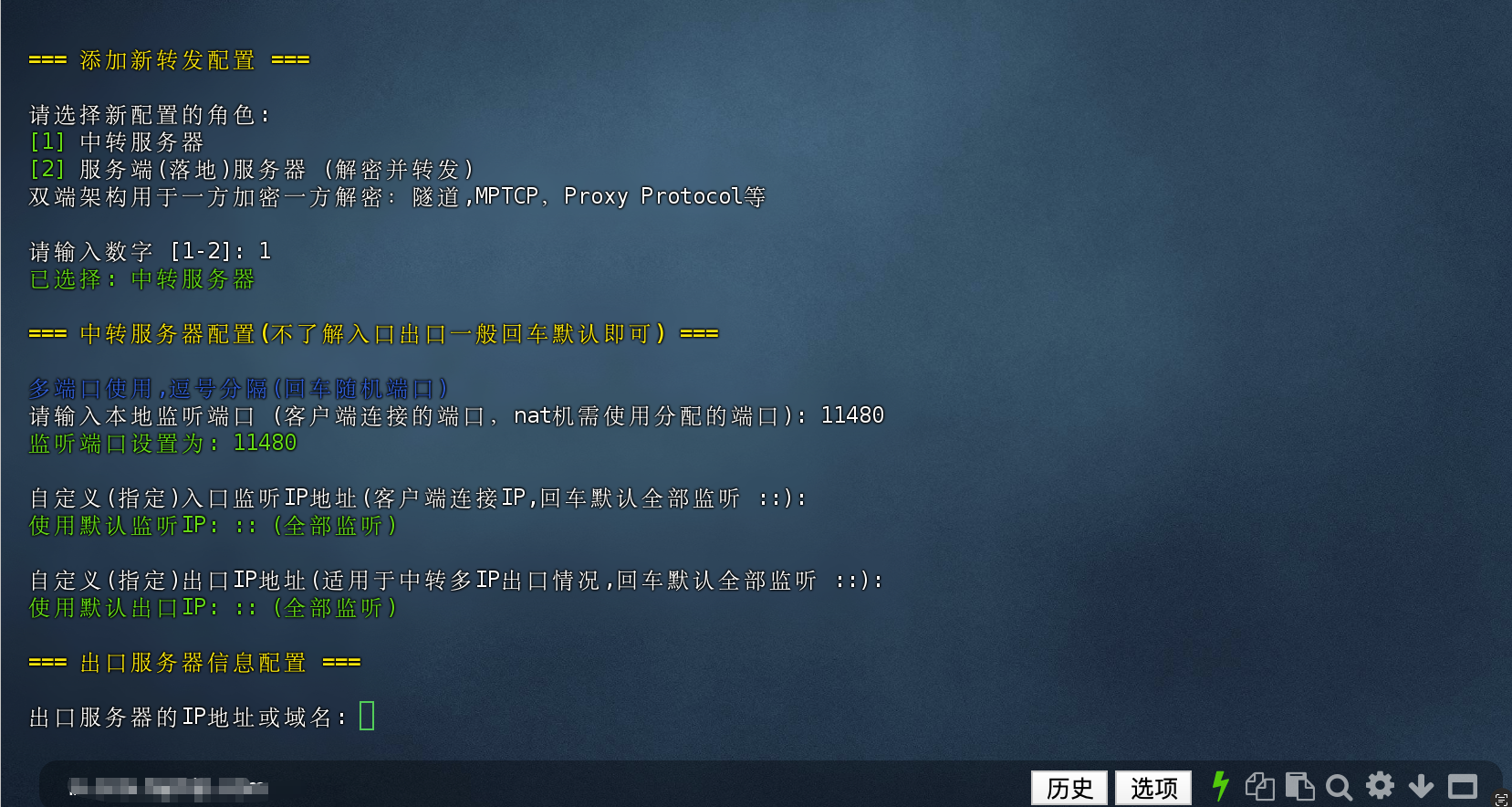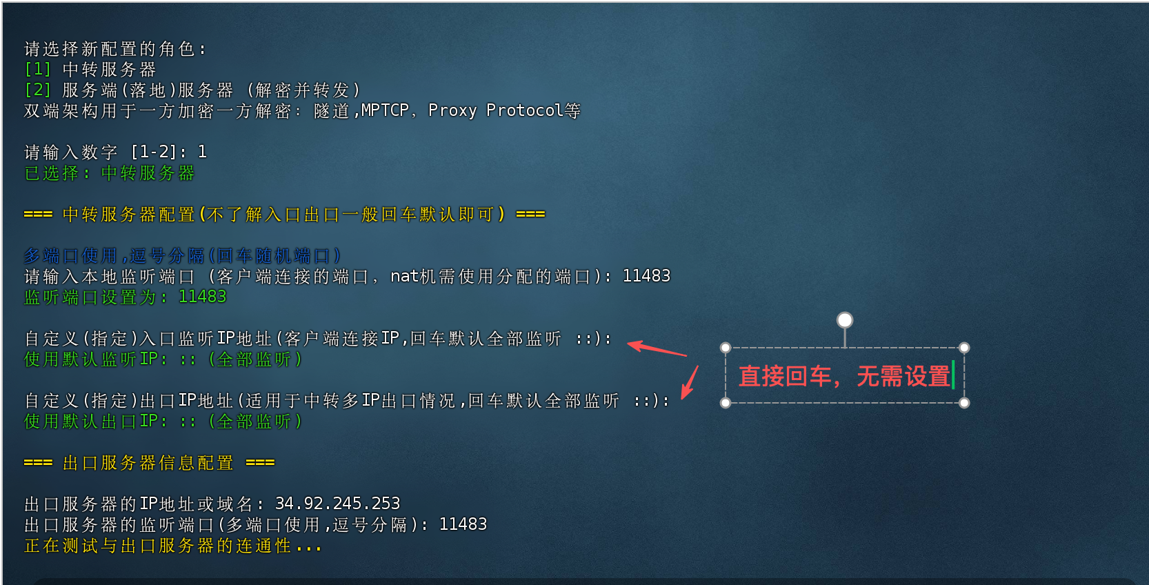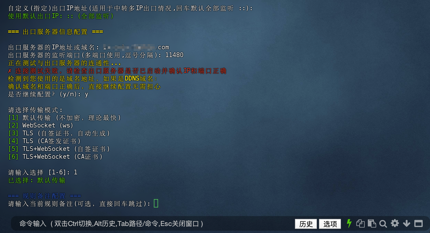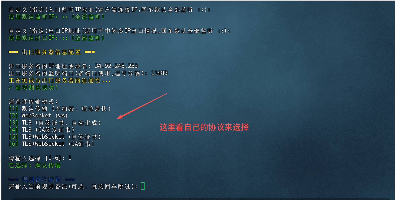 接着上面的输入1,输入端口:11480,按回车输入IX专线的ip或者域名:5.6.7.8(举例)